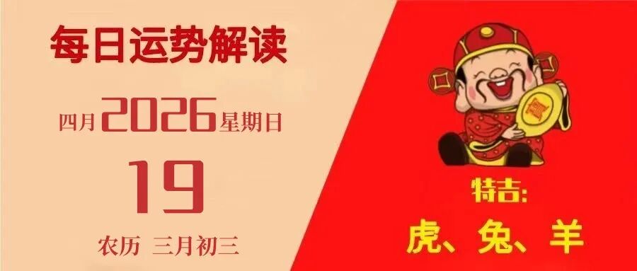 【运势播报】2026年04月19日,星期日,农历三月初三(丙午年壬辰月癸亥日),法定节假日。建星吉凶:危日值日天星:玉堂今日五行:大海水特吉生肖:虎、兔、羊次吉生......[查看详细][每日运势]