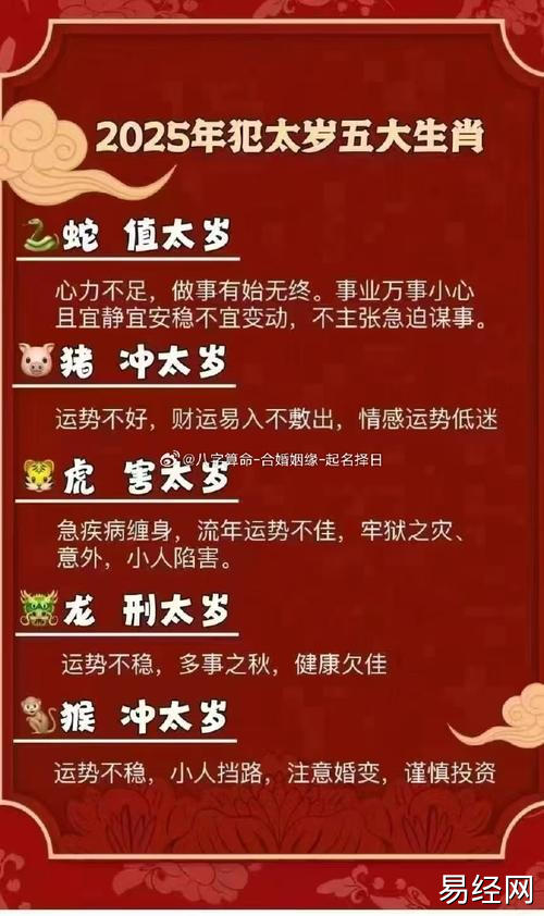 易经网推荐2025最新兔年属蛇会犯太岁吗女孩 兔年冲太岁戴红绳是什么意思?,最新生肖运势,下面是详细内容: 太岁方位与影响 太岁,又称岁神,掌管一年的祸福吉凶。兔年太岁为癸卯木神,方位在正东方。属...