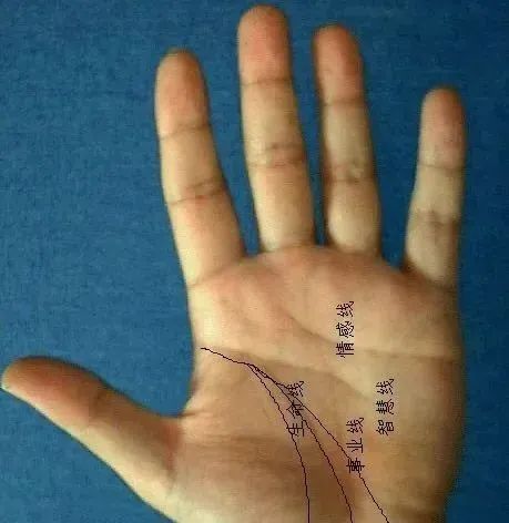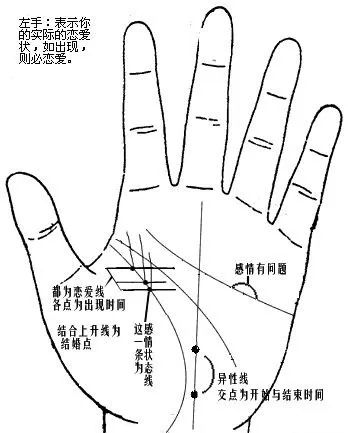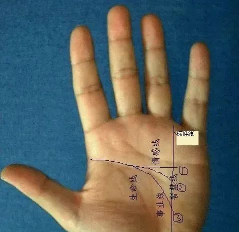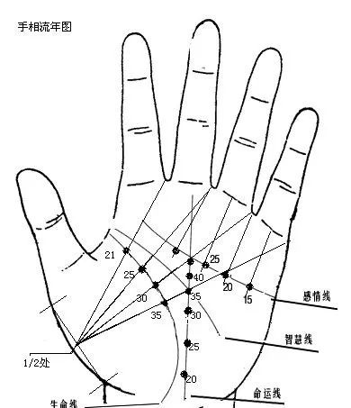 右手:1,精力欠佳,无精打采。易生病。2,一般 。3,精力旺盛。 总论:左手代表一个人的遗传的智力,右手代表一个人的实行力。 左手:1,表示记忆力好,逻辑思维力强。2,为一般,为1,3的过度。3,表示想象力好,越往掌心靠近越有想象力,悟性高,适合研究。理解力强,但记忆力差,能不能研究算命就看这了。 右手:1,表示动手能力强,喜欢实干,说做就做,计划性不够。语言表达能力好,社交好 。2,表示一般,为1,3的过度 。3,表示喜欢说不喜欢做,喜计划而不喜欢行动,懒,越往下垂越懒。总论:表示一个人的性格,尤其是对异性,对感情的表达与否 。先分长短,长的人热情,短的冷淡以标准线为准定长短。总论:左手表示对你所生活的环境的适应性,右手表示操心。 左手:表示对生活环境的适应力。很清晰,深刻表示对环境很满意,适应,反之则不适应,对环境不满足。 右手;表示操心与否,很深刻表示很操心,劳神。反之,则不操心,轻松,无压力。 解释:手相流年中,生命线,命运线,感情线很重要,其他不太用。 生命线:从实指与拇指的中央开始,年龄有小到大,开始为18岁,依次为各点所标 还有一种办法,是用食指垂直按下,从开始到一个食指的宽度的距离,这一点是21岁。 命运线:从手腕为1岁开始,到中指根部年龄逐渐递增。命运线与智慧线交点为35岁,与感情线交点为50岁,这两点中间为40岁。关注透天机。其他按这几年的距离分。 感情线:从小指边上开始为男(20岁),女(18岁),小指中间的感情线为女(23)男(25),其他类推。左手生命线表示运气,如果哪段不好有岛纹则表示这段时间运气不好。 上升线:为从生命线出发,向上的分线。左手表示有喜庆之事,那一年看流年。 恋爱线:从感情线那边插入生命线的弧线。在那里出现表示有出现喜欢得人。 感情状态线:贴生命线内侧的平行线,有时拐弯的。为感情的状态。一般出发点是恋爱线的时间。就是看何时有人出现,结果怎样。