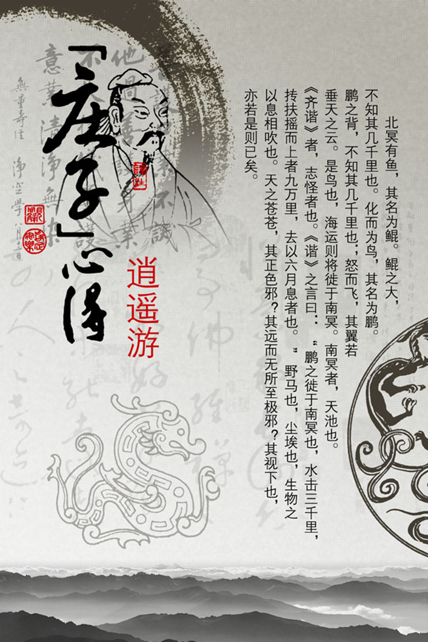 乘天地之正,而御六气之辩,以游无穷者。 庄子可能是最喜欢鱼的哲学家了。“授人以鱼,不如授人以渔。” “北冥有鱼,其名为鲲。鲲之大,不知其几千里也。化而为鸟,其名为鹏。鹏之背,不知其几千里也。怒而飞,其翼若垂天之云。是鸟也,海运则将徙于南冥。南冥者,天池也。” 庄子在逍遥游中为我们虚构了一个神奇无比的鲲鹏的形象。鲲鹏等风来、乘风起逆风行,到最后如果能够取消对风的依赖,就能实现逍遥的境界。 人生其实也是这样,人生是从有所待到无所待进化的过程,你掌握了无所待,你就能成为庄子眼中的至人、神人和圣人。 为何《庄子》的开篇,就是逍遥游?因为逍遥游中寄托了庄子的人生理想。庄子,把人生的三种境界藏在鲲鹏扶摇而起的故事中,让我们去细细品味。