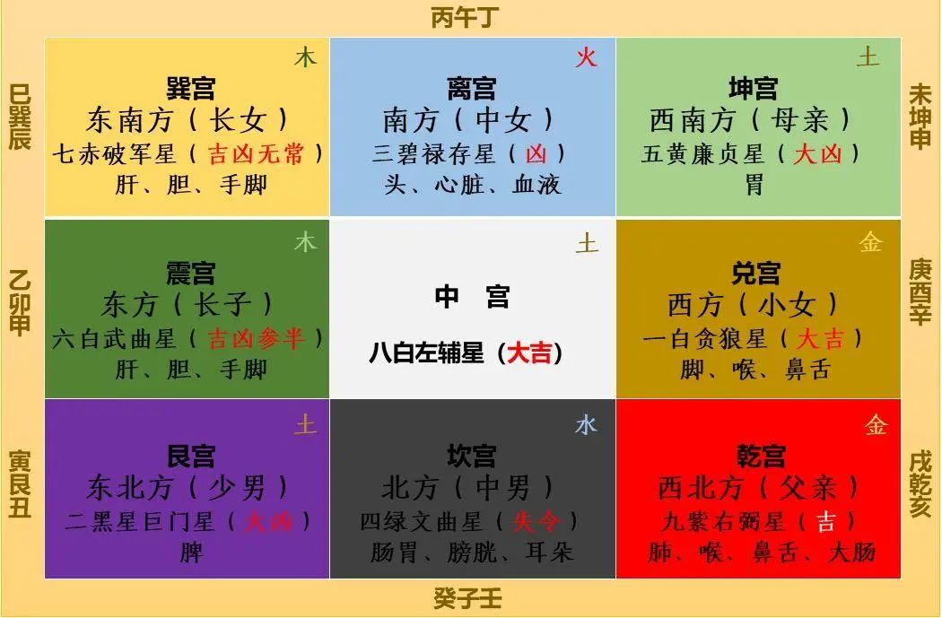 少腹:离、坤、未 心: 离、丁、戌 肝: 震、巳、丑 胆: 甲、寅、子、卯 肺: 兑、辛、寅 胃: 坤、未、辰 脾: 艮、未、巳、卯、丑 肾: 坎、兑、癸 三焦:巳 心胞络:巳 命门:丁、辰、戌 大肠:庚、申、卯 小肠:巳、丙、未 膀胱:亥、壬、子、申 肛门:亥、子 精血:申、酉、坎、兑 臀: 壬 尻: 癸 腿: 巽、辰、戌 胰: 辛、戌、辰、午 足: 震、子、丑、癸、辰、戌 臁: 戌、子、丑、壬、癸 踝: 坤 胫: 丑 脚: 癸、子 跟: 癸 涌泉:亥、癸 脚指丫:未 阴茎:坎、壬 卵: 坎 阴户:亥、巽 月经:癸、酉 血: 离、兑、卯、艮 筋: 申、卯 骨: 亥、申 髓: 亥 胞(子宫):癸、辰、巳 皮肤:子、辰 瘠: 离