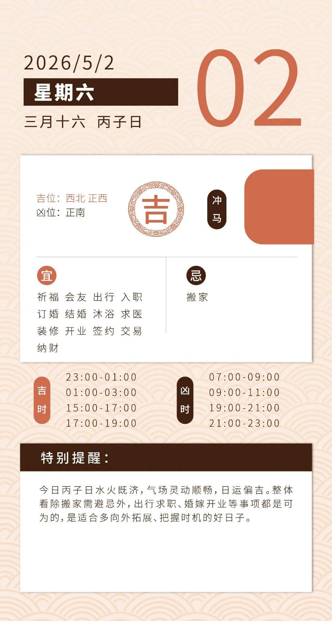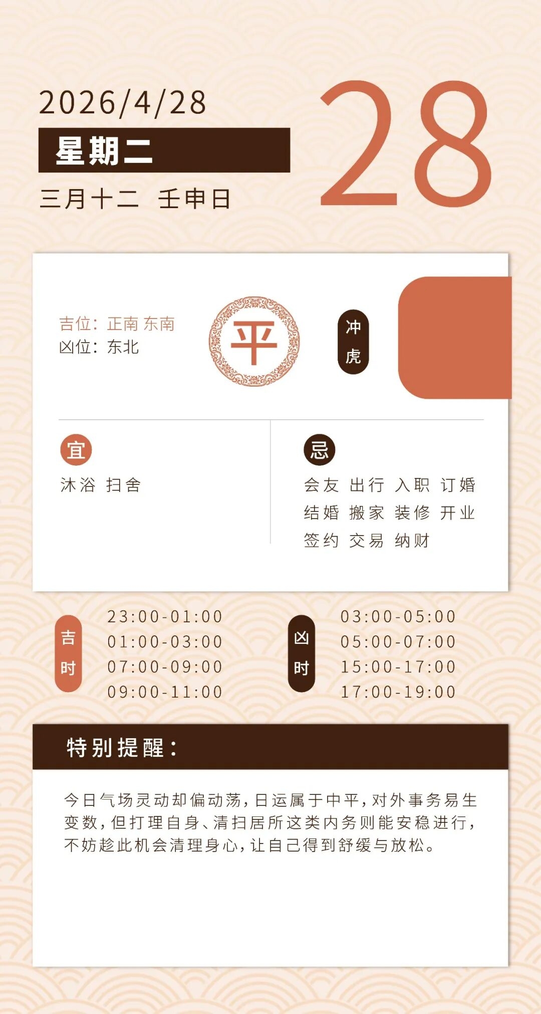 3、切勿被运势吉凶“绑住手脚”,不要太执着或是过度自我暗示以至于耽误正常生活步伐。境随心转,心态好则万事安。