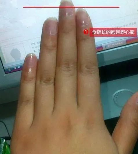 大拇指代表一个人的生命精力,可看到父母遗传。第一指节代表意志力、恒心和耐性。第二指节代表决断力、适应力和智力。大拇指两指节相等者,表示本人意志力与决断力均衡。大拇指第一节代表意志,第一节过长的人,意志力很坚强,不怕失败,但处理事情常常缺乏理性的判断。大拇指第二节代表理性,第二节过长的人,智慧高,聪明过人,思路清晰,理解力强,冷静沉着。第一指节长于第二指节的人,表示其精神与人格受母亲影响较大;第二指节长于第一指节的人,表示其精神与人格受父亲影响较大。当一个人伸出手掌时,大拇指与其余四指之间张开的角度越大,个性越独立自主、积极负责,不喜欢被拘束,有创造力,喜欢自由发挥。反之代表保守、依赖,缺乏开创力。食指五行属木主肝胆,主魂魄;食指在手相学中,通常意味着支配欲、权力欲与一个人的进取心、自尊心及胆量。所以食指较长的人,性格也比较顽强,具有企图心,有胆量,很多军官警察就是这种手指。食指形状端正秀长润泽的人,代表青年时期运势顺利,身体健康,学业有成,事业顺利,对感情也能认真负责,财运方面,食指长的人一般财运不错,(是相对于自己的中指较长/短)但敢赚敢花,很难留住钱。食指较短的人有一些缺乏自信,责任感不是很强,没什么野心、上进心,正因如此在职场上的表现也不是很出色。同时与身边朋友、亲友的关系也算不上很好。食指歪者,歪向外而离中指,主贫。斜者,斜向内而傍中指,主衣食不缺,但不免奔走于四方。食指小者,不断变更衣食之地而不得其所。尖削者,败穷。短者,克妻、畏妻、衣禄不足。曲者,劳碌江湖。凹者,孤独。伤者,无成。