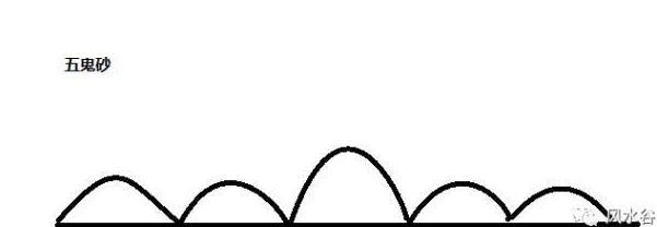 曰:五个金星相连即是五鬼砂。何唤名之曰五鬼砂,金者,乃官鬼也,金性喜杀,戮威权。正则为官,邪则为鬼。五鬼砂四六皆不行,必为五才可应验(因为“五”属土,土生金,所以五个才可应验),——相传在青莲,有一个姓唐的人家,他们的祖上葬于大雾山前,他们的后代经常会捡到钱,却不多,很少超过十两银子。是因为斜对五鬼砂,所以就经常有这种预兆。