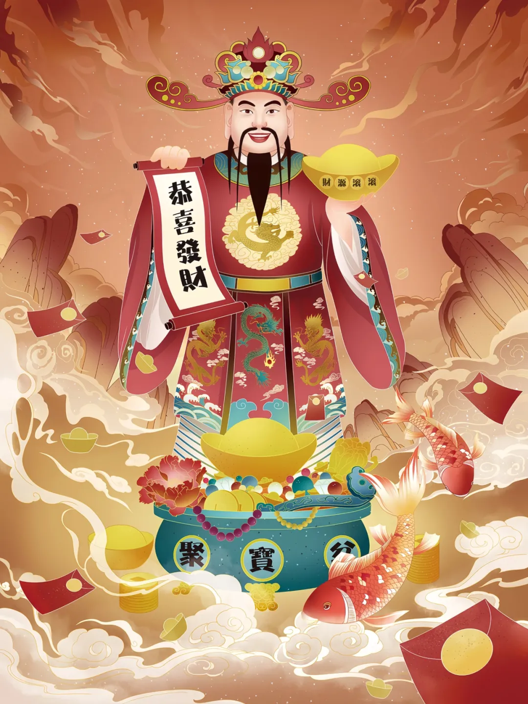 其余四路为东路财神招宝天尊萧升、西路财神纳珍天尊曹宝、南路财神招财使者陈九公、北路财神利市仙官姚少司。
