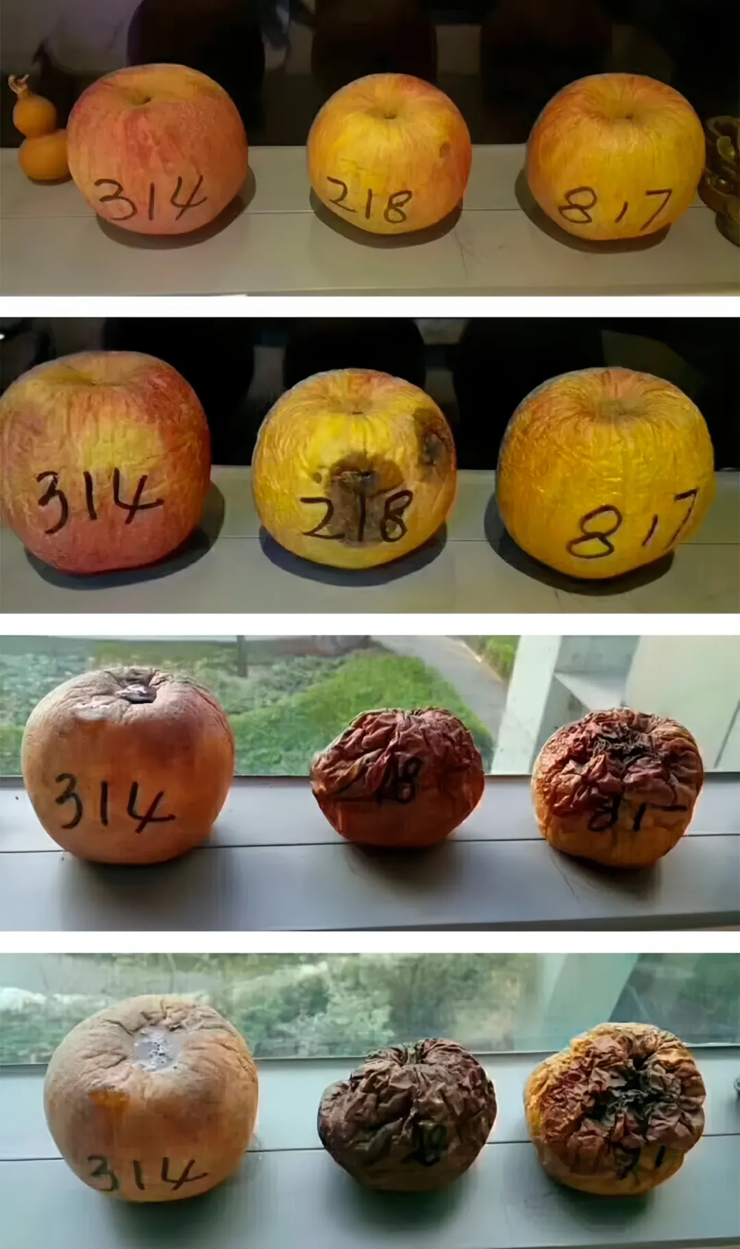 在同一时间统一批次购买的三个苹果,分别写上314,218,817三组数字,3个月后。 标记数字“314”苹果外形还很完整,饱满; 标记数字“218”苹果已经变黑,腐败至完全看不出来; 标记数字“817”苹果腐烂发臭,形状完全改变!