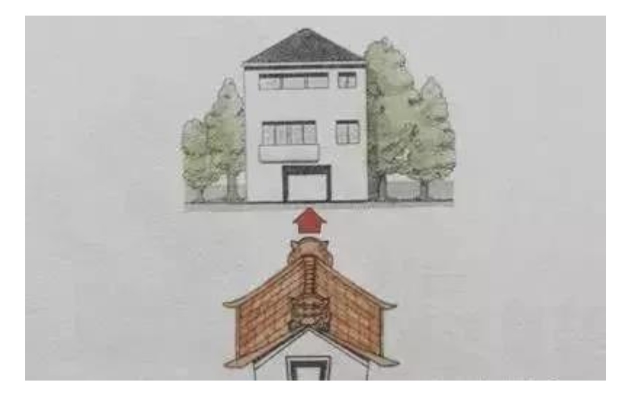 主屋和另一个房屋呈丁字形排列住宅,又称冲丁煞。住在这种宅形的住宅中,会忤逆师长,行为放荡,有招致灾祸,身体损伤的危险。