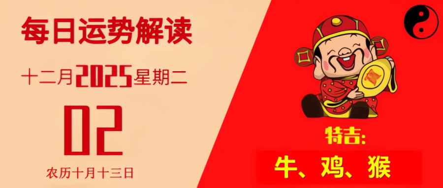 【运势播报】2025年12月2日 星期二,农历十月十三日乙巳年丁亥月乙巳日),法定工作日建星吉凶:破日值日天星:勾陈(黑道日)今日五行:佛灯火特吉生肖:牛、鸡、猴次吉生肖:羊、龙、蛇今日不吉:鼠、虎、猪喜神...