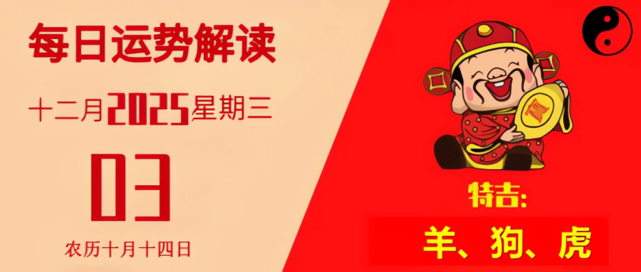 【运势播报】2025年12月3日 星期三,农历十月十四日,乙巳年丁亥月丙午日),法定工作日建星吉凶:危日值日天星:青龙(黄道日)今日五行:天河水特吉生肖:羊、狗、虎次吉生肖:龙、蛇、猪今日不吉:牛、马、鼠喜神...