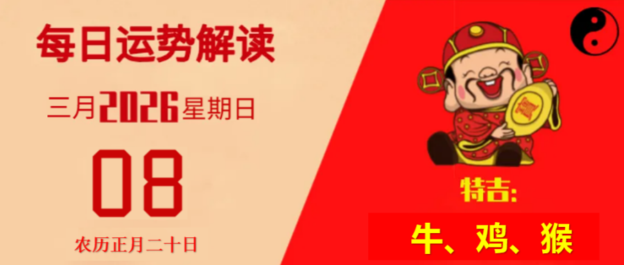 【运势播报】2026年3月8日 星期日,农历正月二十日(丙午年辛卯月辛巳日),法定节假日建星吉凶:满日值日天星:朱雀(黄道日)今日五行:白腊金特吉生肖:牛、鸡、猴次吉生肖:羊、龙、蛇今日不吉:鼠、虎、猪喜神...