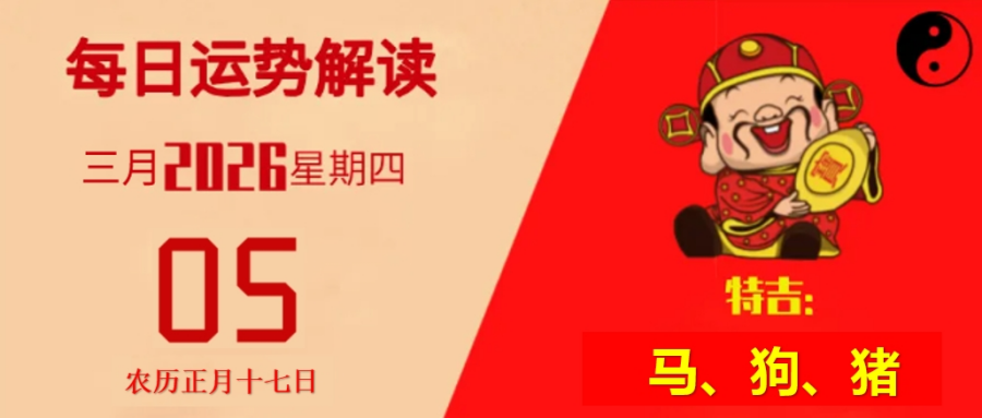 【运势播报】2026年3月5日 星期四,农历正月十七日(丙午年辛卯月戊寅日),法定工作日建星吉凶:闭日值日天星:青龙(黑道日)今日五行:城头土特吉生肖:马、狗、猪次吉生肖:鸡、兔、虎今日不吉:牛、蛇、猴喜神...