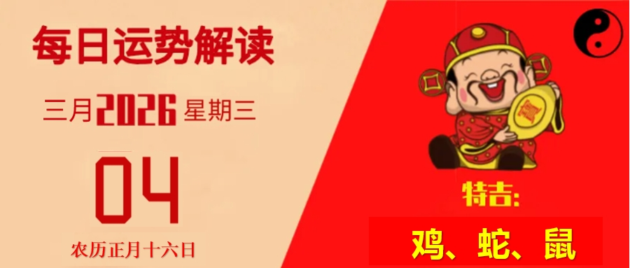 【运势播报】2026年3月4日 星期三,农历正月十六日(丙午年庚寅月丁丑日),法定工作日建星吉凶:闭日值日天星:明堂(黄道日)今日五行:涧下水特吉生肖:鸡、蛇、鼠次吉生肖:猴、牛、兔今日不吉:狗、马、羊喜神...