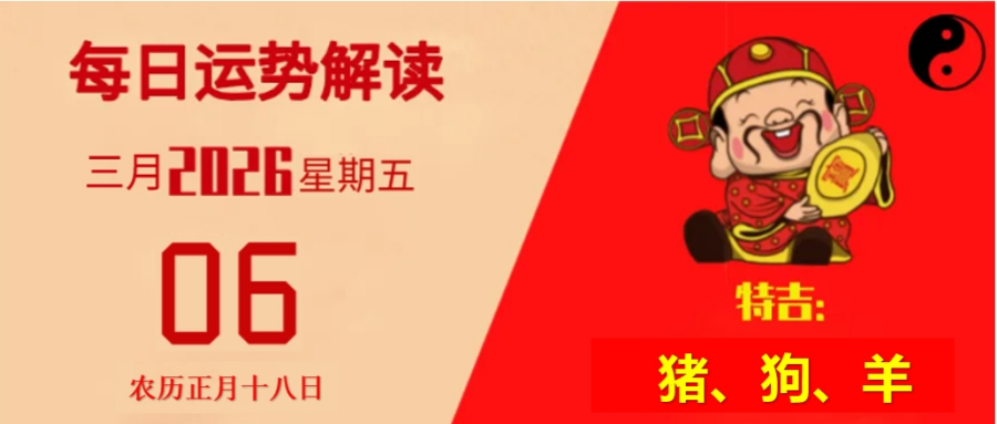 【运势播报】2026年3月6日 星期五,农历正月十八日(丙午年辛卯月己卯日),法定工作日建星吉凶:建日值日天星:明堂(黄道日)今日五行:城头土特吉生肖:猪、狗、羊次吉生肖:兔、蛇、虎今日不吉:鼠、龙、鸡喜神...