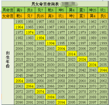 男女命卦速查表