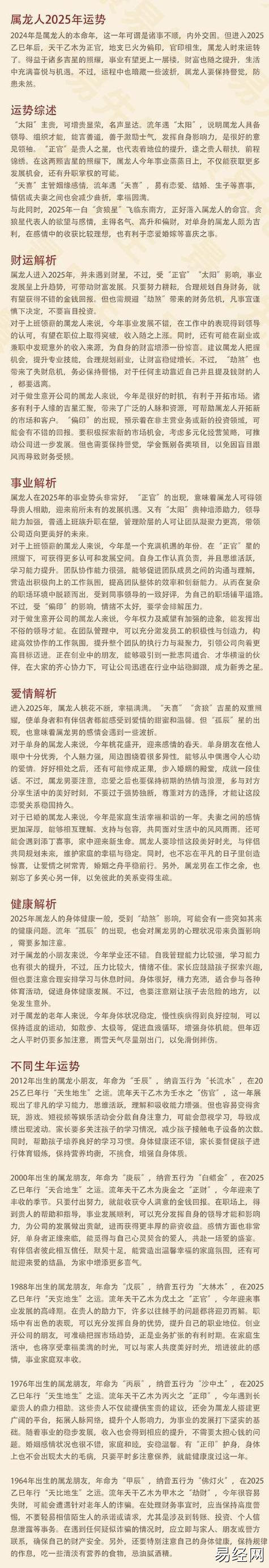 2025最新88年属龙今日运势怎样呢 今天88年属龙的运气和财运怎么样是什么意思?,最新生肖运势由易经网整理发布!,2025最新88年属龙今日运势怎样呢?今天88年属龙的运气和财运怎么样?这是许多属龙人士关心的问题。根据最新的生肖运势分析,88年属龙的人在2025年的今日整体运势较为平稳。事业上可能会遇到一些小挑战,但只要保持积极心态,便能顺利度过。财运方面,不宜有大额投资,但日常开销可控,适合储蓄。感情方面,单身者有机会遇到心仪对象,已婚者需多沟通。健康方面,注意休息,避免过度劳累。总体来看,今日属龙之人宜稳中求进,不宜冒险。