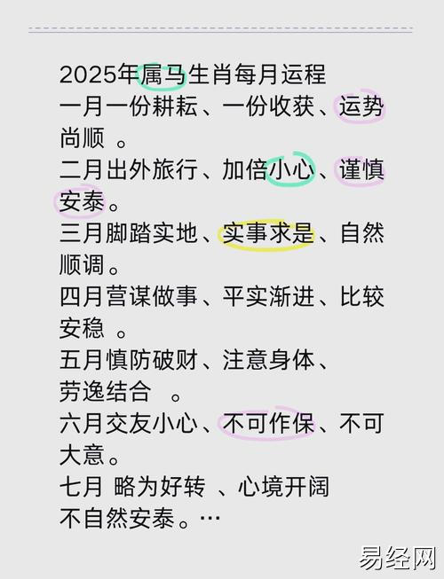 2025最新78年属马女2025年每月财运 78年属马女士2025年运势是什么意思?,最新生肖运势由易经网整理发布!,2025最新78年属马女2025年每月财运 78年属马女士2025年运势是什么意思?2025年对于1978年属马的女性来说,整体运势平稳中带有机遇。1月财运一般,需谨慎理财;2月财运上升,适合投资;3月需注意健康问题;4月事业有进展,财运随之提升;5月不宜大动,保持稳定;6月财运较好,可尝试新机会;7月需防小人,财务上要小心;8月运势最佳,宜把握时机;9月财运平稳,宜储蓄;10月需注意人际关系;11月财运回升,适合规划未来;12月总结全年,为来年做准备。