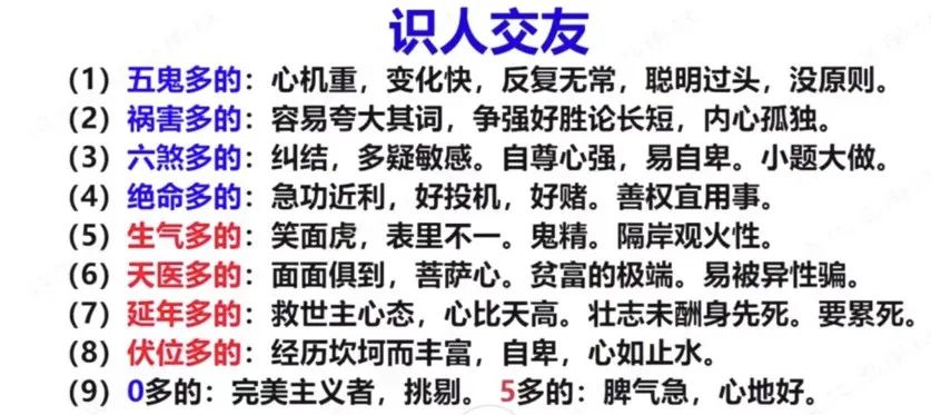 影响命运的十大因素:一命、二运、三风水、四积阴德、五读书、六名、七相、八敬神、九交贵人、十养生 先天之命我们是无法改变的,但是后天运势我们是可以通过各种方法来调整的。例如数字能量学。 我们身边有很多的磁场,比如说:车牌号码、门牌号码、手机号码、身份证号码、银行卡号码等等,其中手机号码的磁场是对我们人体影响最大的磁场,手机是和我们息息相关的,我们每天都在使用手机,每天都在打电话接电话,一来二去,手机号是影响我们最大的磁场。 你的手机号码是独一无二的,拨打你的手机号码,只有你的手机号在响。所以手机号码的磁场深深的影响着我们的事业、财运、婚姻、健康等等。 生气加绝命磁场数组的组合有:412 、673、937 、821 、148 、769 、396 、284 生气是人缘,朋友,同事,绝命相信朋友,同时代表冲动破财。 如412,相信朋友,可能是酒店服务员,同时也因为朋友耗财。 生气加绝命磁场几乎会是无条件对朋友好的磁场组合,其原因是绝命磁场"单纯"的思维,不会去辨别朋友说的话是对还是错,因此该磁场很容易相信他人。在这个磁场搭配中,生气本身的能量又可泛指朋友,绝命磁场是没有"规划"的,因此他们不是不懂得"挑"朋友的。这是所有磁场组合中最重视朋友最容易相信朋友的磁场组合。 正因为这个磁场是很相信及重视朋友,因此也往往因为朋友而‘’耗财‘’。绝命磁场是敢于投资的,因此许多时候会听信‘’朋友‘’的话去投资,能有多少回报也要看前后数字的搭配。 这个磁场组合也是很懂得享乐的人群,因为生气磁场本身是最懂得享受人生的磁场,而绝命磁场对其没有规划的同时,这一点也在生活中放大。 同时,这个磁场组合也是最为懒散的磁场组合之一,尽管绝命磁场的冲劲极为强大,但是该组合在平日里拖拖拉拉,不修边幅,不想受思想约束,希望能够逍遥自在,只有在遇到感兴趣的事情,他们做事的热情才会非常大。 绝命是容易大起大落的磁场,绝命磁场是敢于做事,好胜心强,敢拼的磁场,在事业上容易有‘’爆破力‘’,但是当有所成的时候,她们又不知道如何‘’守成‘’。因此突然下跌而跌的很厉害,人生际遇起伏波折,在起的时候,绝命磁场很容易将生气的“无所谓‘”及“开心”将自己的成果给消耗掉。当事业落的时候,没有了原来的积蓄,就只能从零开始,甚至负倒债累累。 但是生气加绝命磁场组合是不容易被打垮的,这个磁场组合的“逆商”非常之高,就算失败又算什么呢?强大的好胜心及充沛的精力又促使他们再一次踏上新的征程,在社会上这类人多不胜数,当拿到好的数字磁场组合,他们将会是最大的赢家。 提示: 一个适合自己的手机号码是不容易匹配的,不但需要与的命理八字进行搭配,还需要使手机号码发出正能量磁场信息时,才能使你在生活中得到更好的运势,财富,婚姻,健康,事业,收获自己想要的幸福生活。希望朋友们别只是从文章中了解过数字能量学,只懂得一些知识,就给你自己或身边的朋友匹配号码,这样不一定能匹配要好的号码,更有可能的是匹配到的是比之前更差的号码! 注:全吉未必吉,全凶一定凶。 弘扬中华优秀传统文化,传播正能量,助人助已,关于财富,事业,爱情,健康,朋友等人生问题,下面就分享一些案例解析,希望对数字能量学感兴趣的朋友有所帮助: 关于财富 一、生财之道的数字磁场: 1、生气+天医:贵人帮助生财(931,413) 解释:如果你是单位的领导或主管就非常适合,因为你的领导对你很器重。 2、延年+天医:事业帮你获得了财富(913,431) 解释:通过自己的努力去赚钱,可能你是老板也可能你是区域经理。 3、绝命+天医:投资或在外跑动挣钱(213,968) 解释:在外跑动挣钱,例如做售后的,要账的都算。投资挣钱,例如213就是从事风险大的行业生钱,例如股票,彩票等等,当然也表示事业做的比较大,去投资赚钱。 4、祸害+天医:开口说话就赚钱(231,713) 解释:靠嘴吃饭的行业,例如老师,演讲家,保险业务员等等。 二、花钱之道数字磁场: 1、天医+贵人:赚钱后对朋友很大方 2、天医+六煞:赚钱花在家里或女人身上 3、天医+延年:赚钱就存起来或去理财,决不浪费 4、天医+绝命:赚钱就去投资,或者花费,特别能花钱。 例:869在手机号后面,就是破财。861代表赚钱就买房子或花在你女朋友身上。 关于投资 一、投资数组磁场: 1、绝命+天医:通过投资赚到了钱。 2、天医+绝命:有点钱就投资 3、绝命+延年:投资理财,或买房子 二、数字0和5对投资的影响: 0代表被动的,隐藏的;5代表主动的显现的。 例:351代表,比31赚得更多一点。301代表赚的钱年不见,也可能被套住了,股票的话叫被套牢。生意的话,钱变成货被压住了。 若是73051,73代表投资,0代表套住,5代表增强。 一句话说就是:做了一个小投资,刚开始被套住了,后来挣到了大钱。 关于婚姻 一、正桃花磁场: 生气+天医:朋友给你介绍了一个可结婚的对象。 天医+天医:天医代表正桃花,两个正桃花,代表有结婚的可能。 例:13,68 磁场能量强,容易遇到结婚的对象。 94,72,磁场较弱,可能是遇到了心动的异性朋友,只是想想,结婚不太容易。 103,608 0代表隐性的。代表已经有暗恋或地下情,若已经结婚,代表聚少离多,或是两地分居。 1313:容易遇到比较中意的人,婚后也非常的幸福。如果不在一起,代表有好几段感情。 二、偏桃花磁场: 六煞水代表桃花,也是偏桃花磁场能量的代表。 以