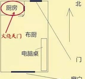 这是最常见的一种说法,就是家中的西北方位见到炉灶或高物。因为在风水中,西北方为乾位(即天门),乾卦,是家中父亲角色的人的位置,又是升官发财的关键位置,宜生不宜克,生则有利,克则必凶。乾卦五行属金,最怕火来克,而炉灶正是火旺之物,位于西北便是重火克金的格局,因此称为火烧天门。实际上凡是在西北方位见到阳性火旺的物体,如红色的大柜子、高山、高塔、变压器、桥梁、大树、消防队、部队大院、寺庙、公安局、检察院、法院等等,都以火论,都视为广义的“火烧天门”。