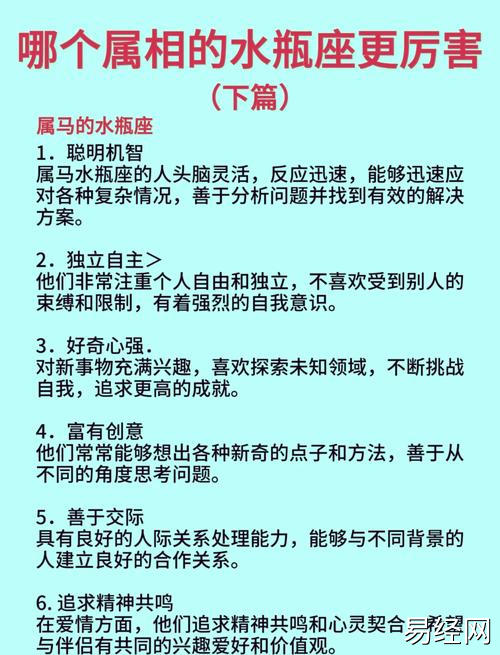 易经网推荐2025最新水瓶女属马感情运势 水瓶座属马的女人是什么意思?,最新生肖运势,下面是详细内容: 水瓶座的独立与理性,与属马的奔放与热情,在水瓶女属马的身上碰撞出独特的火花。她们的感情世...