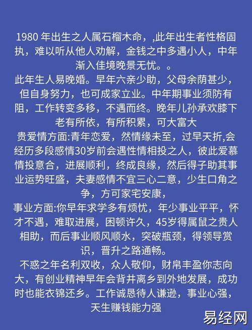 易经网推荐2025最新1980年属猴男婚姻命运是什么意思?,最新生肖运势,下面是详细内容: 命理基础 属猴男五行属金,生于庚申猴年(1980年)。 天干庚为阳金,代表固执、果断和自信。 地支申为猴,属阳金,代...