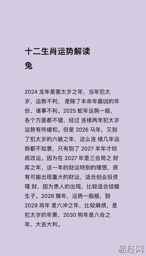 易经网推荐2025最新属兔十二月运势2025 属兔在2025的每月运势是什么意思?,最新生肖运势,下面是详细内容: 2025年12月,属兔人的运势在事业、财富、感情和健康等方面都有所变化。以下是对属兔人在2025...