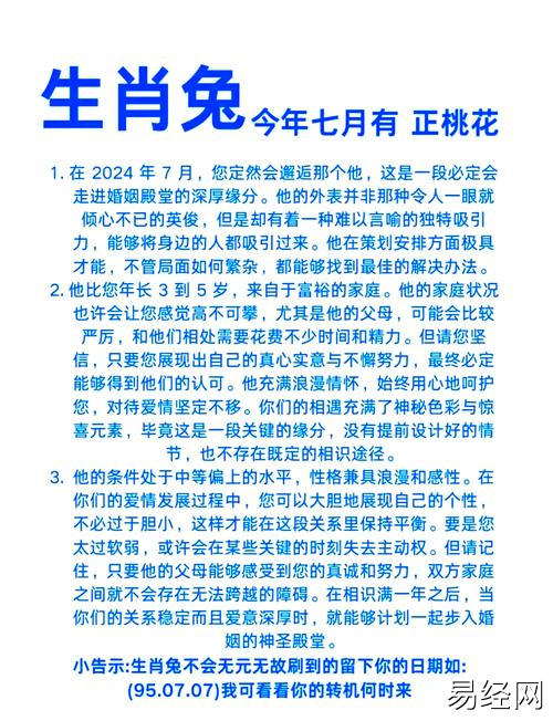 易经网推荐2025最新今天属兔的桃花运会旺吗 2025属兔招财旺运手串是什么意思?,最新生肖运势,下面是详细内容: 今日,当太阳的光辉洒向大地,我们聚焦于生肖兔的朋友们,探讨一下他们今日的桃花运势。...
