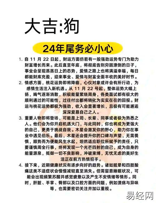 2025最新属狗女36岁运势 属狗的招财物件是什么意思?,最新生肖运势由易经网整理发布!,2025最新属狗女36岁运势显示,这一年整体运势较为平稳,但需注意人际关系和财务规划。属狗的招财物件通常指一些被认为能带来财运的物品,如貔貅、金蟾等,这些物件在传统文化中被视为招财进宝的象征。对于36岁的属狗女性来说,2025年是事业和家庭兼顾的一年,建议多关注自身发展,同时合理安排财务,避免不必要的开支。保持积极心态,有助于提升整体运势。