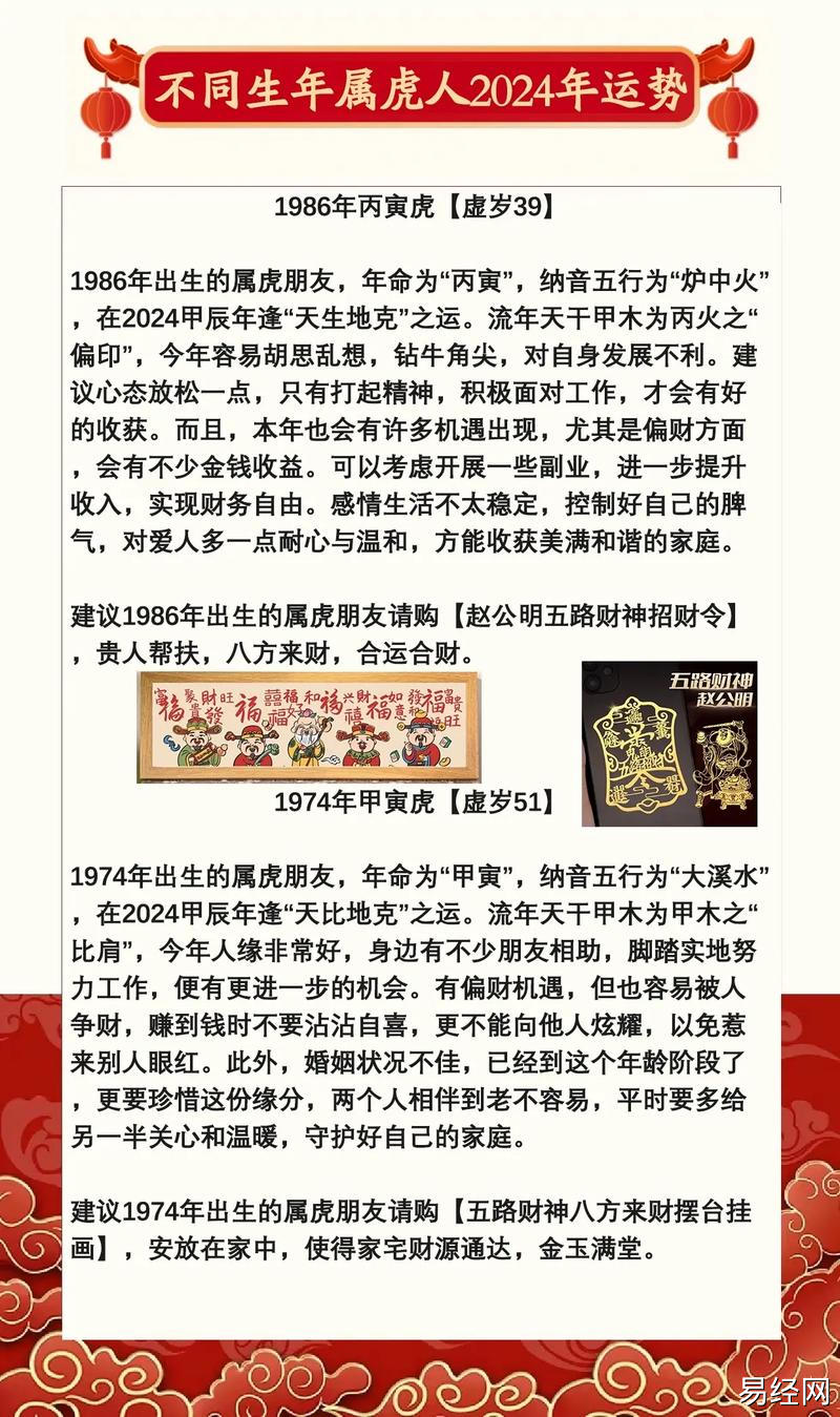 2025最新属虎的今年财运是身体 属虎今年的财运及健康状况是什么意思?,最新生肖运势由易经网整理发布!,2025最新属虎的今年财运是身体,属虎今年的财运及健康状况是什么意思?2025年属虎的人财运整体较为平稳,但需注意理财方式。年初可能有意外支出,建议合理规划预算。健康方面,需关注肠胃和呼吸道问题,保持规律作息。工作压力较大,适当放松身心有助于提升运势。整体而言,需谨慎行事,方可顺利度过这一年。