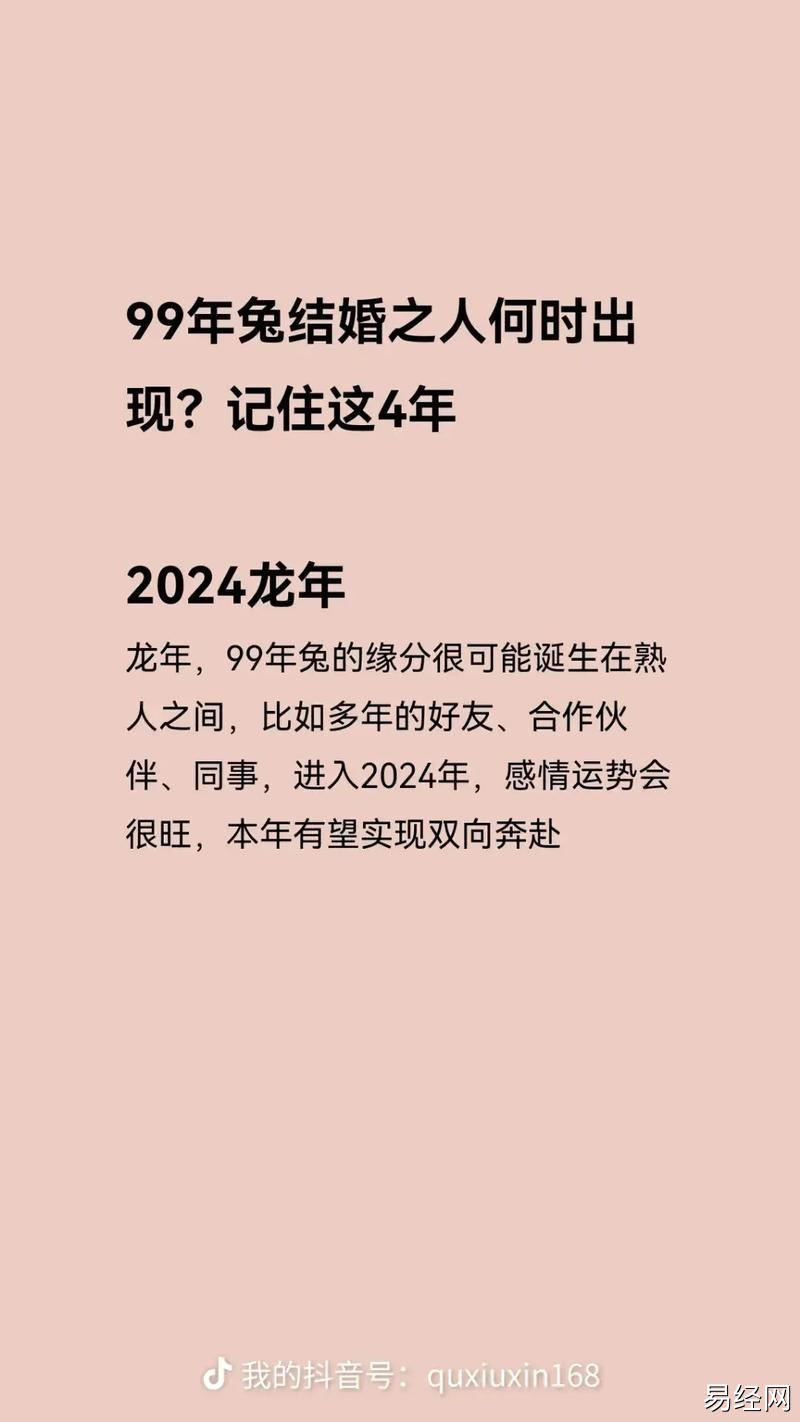 2025最新99年属牛女兔婚姻 1999年兔男和牛女是什么意思?,最新生肖运势由易经网整理发布!,2025最新99年属牛女兔婚姻,1999年兔男和牛女是什么意思?在生肖配对中,1999年属兔的男性与属牛的女性组合,通常被认为具有互补性。兔男性格温和,注重细节,而牛女则踏实稳重,富有责任感。两者在感情中能够互相扶持,建立稳定的家庭关系。2025年,这对组合的运势整体向好,尤其在事业和家庭方面有提升机会。不过,需注意沟通方式,避免因小事产生矛盾。生肖运势提示,保持包容与理解,有助于增强彼此信任,迎接更美好的未来。