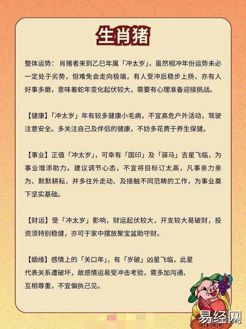 2025最新近三天属猪的人运势如何 2025年属猪全年运势是什么意思?,最新生肖运势由易经网整理发布!,2025最新近三天属猪的人运势如何?2025年属猪全年运势是什么意思?2025年属猪的人整体运势平稳,事业上会有新的机会,需把握时机。感情方面,单身者有望遇到心仪对象,已婚者需多沟通。财运较好,但不宜过度消费。健康方面注意饮食和作息。近三天运势逐渐上升,适合出行和决策。