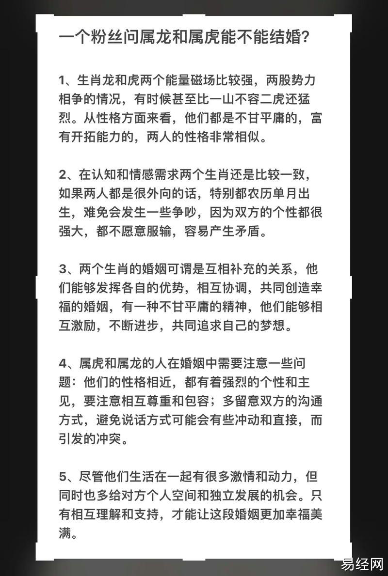 2025最新虎和属龙的婚姻般配吗 母亲属龙儿子属虎好吗是什么意思?,最新生肖运势由易经网整理发布!,2025最新虎和属龙的婚姻般配吗?母亲属龙,儿子属虎好吗?是什么意思?在生肖文化中,虎与龙的组合常被认为是既有冲突也有互补的关系。虎象征勇敢,龙代表尊贵,两者结合可能带来激情与挑战。母亲属龙,儿子属虎,这种组合在家庭关系中可能意味着母亲性格强势,儿子独立自主,需相互理解。2025年,虎与龙的运势需注意沟通与包容,才能化解矛盾,促进和谐。