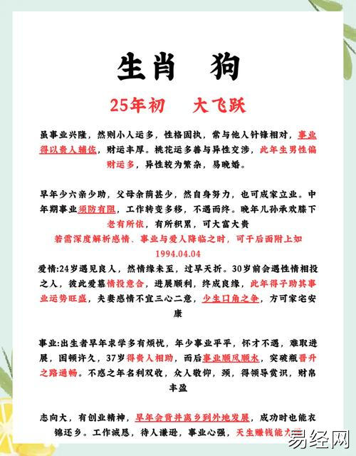 2025最新70年属狗的人性格运势 70年属狗的今年啥运势是什么意思?,最新生肖运势由易经网整理发布!,2025最新70年属狗的人性格运势 70年属狗的今年啥运势是什么意思?70年属狗的人性格直率、忠诚,为人正直,重情重义。2025年是兔年,属狗的人在这一年整体运势平稳,事业上需谨慎行事,避免冲动决策。感情方面,单身者有机会遇到合适对象,已婚者需多沟通。财运一般,不宜大额投资。健康方面注意肠胃和情绪管理。整体而言,2025年属狗人需稳中求进,把握机会,提升自我,迎接新挑战。