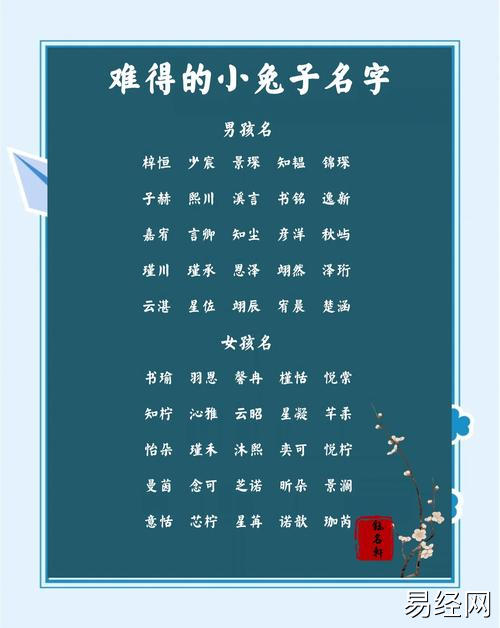 2025最新男孩属兔取什么名字旺财呢 兔微信名字大全是什么意思?,最新生肖运势由易经网整理发布!,2025最新男孩属兔取什么名字旺财呢?兔年出生的男孩,属兔者性格温和、聪明伶俐,适合取寓意吉祥、五行平衡的名字。根据八字五行,可选择带“木”、“水”属性的字,如“泽”、“浩”、“林”等,以增强运势。同时,名字要朗朗上口,避免生僻字。兔微信名字大全是指适合属兔者使用的微信昵称,通常包含象征好运、财富、平安的字眼,如“兔宝”、“祥兔”、“福兔”等。这些名字不仅符合生肖特点,还能带来积极的心理暗示。选择名字时,建议结合家族文化与个人喜好,打造独特而吉利的称呼。