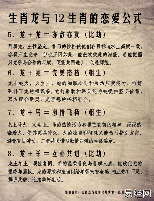 2025最新属龙男属蛇女能配吗婚姻如何 属蛇与龙相冲吗是什么意思?,最新生肖运势由易经网整理发布!,2025最新属龙男属蛇女能配吗婚姻如何?属蛇与龙相冲吗是什么意思?在中国传统命理中,生肖相冲是指两个生肖之间存在一定的冲突和不和谐。属龙和属蛇在十二生肖中确实属于相冲的关系,即“龙蛇相冲”。这种说法源于古代的命理学,认为两者在性格、运势等方面可能存在矛盾。然而,现代社会中,婚姻幸福与否更多取决于双方的沟通、理解与包容。属龙的男性通常性格强势、自信,而属蛇的女性则聪明、细腻,若能相互尊重、携手共进,依然可以拥有美满的婚姻生活。2025年,属龙男和属蛇女的运势各有起伏,需注意合作与信任,共同面对挑战。