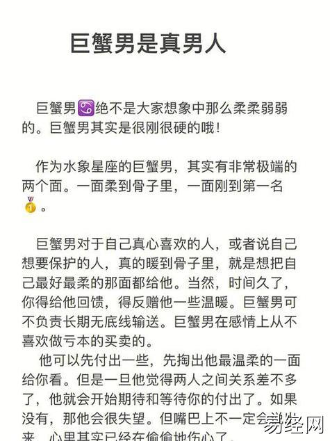 巨蟹男以其细腻和敏感着称。他们情感丰富,内心深处总是对他人充满关怀。对于爱情,巨蟹男更倾向于追求深度而非广度。他们会在感情中投入大量的时间与精力,渴望建立深厚的情感连接。对他们来说,爱情不仅仅是两个人的结合,更是一种心灵的共鸣。