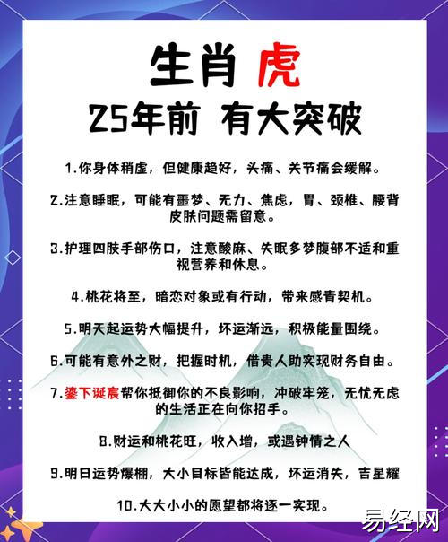 2025最新3月9日属虎运势 1998年属虎终身吉祥物是什么意思?,最新生肖运势由易经网整理发布!,2025最新3月9日属虎运势显示,这一天属虎的人将面临新的机遇与挑战。在事业上,可能会遇到一些转折点,需要果断决策。感情方面,单身者有机会遇到心仪对象,已婚者则需多沟通。健康方面,注意劳逸结合,避免过度劳累。1998年属虎终身吉祥物通常指能够带来好运和保护的物品,如玉佩、生肖摆件等,寓意平安顺遂。选择合适的吉祥物可增强个人气场,提升运势。