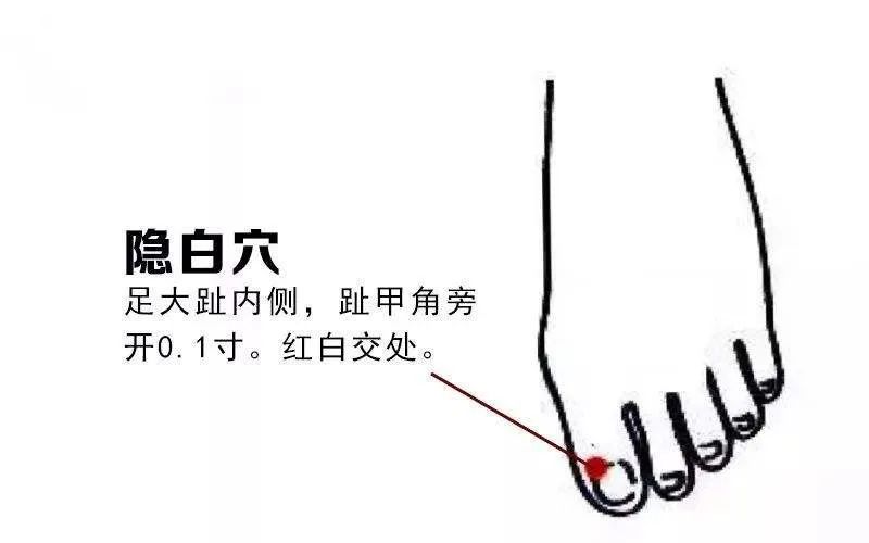 归经:足太阴脾经 位置:在足大趾的内侧,趾甲旁边0.1寸的位置 作用:调经统血、健脾回阳
