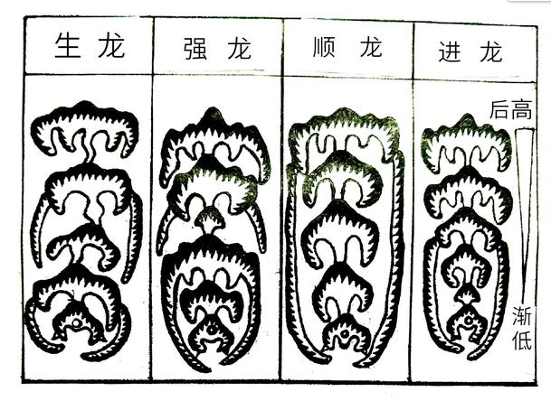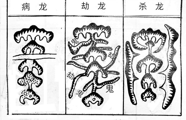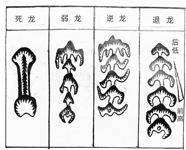 先贤论龙格,总结为:生,死,强,弱,顺,逆,进,退八格。廖瑀《泄天机.全局入式歌》:“讲罢龙行有美恶,生死与強弱。顺逆进退切须知,八法要详推。生是低昂多节目,死是无起伏。强是奔走势力雄,弱是瘦崚嶒。顺是开㬹向前往,逆是向后去。进是龙身节节高,退是渐萧条。生强顺进皆为好,富贵兼寿考。死弱逆退最为凶,夭折受贫穷。” 生龙,星峰磊落,行度起伏顿跌,屈曲活动摆折,节节生意显露,得其穴扦之,主人财旺发,事业兴盛,福禄寿考,富贵绵远。 强龙,星峰雄特,行度踊跃奔腾,势弘力猛,如虎出林、龙入海,气势盛大宏阔,得正穴扦之,主骤发富贵,出人轩昂伟岸,功高业盛。 顺龙,星峰高低大小尊卑有序,枝脚顺前贴身护体,行度团聚,左环右抱,上下照应,得正穴下之,主和睦孝顺友爱,子孙蕃衍,福寿双全,富贵绵远。 进龙,星辰顺序,逐节剥换,由粗至细,由老化嫩,后龙一节高一节如上天梯,此格最吉,若得其穴扦之,主文章奕世高科,富贵显达,财业常进,朱紫满门,发福悠久。 死龙,粗顽臃肿直硬,无起伏摆折之势,随流顺水,如死鳅死鳝,毫无生意,若寻其地安葬先人,必主贫贱穷苦以致死绝,纵作社坛亦无灵显。 弱龙,山头瘦削露骨,龙身单薄孤陷,懒缓筋现,斜侧无倚,枝脚散漫无收拾,行度间遭风吹水劫,此等龙若误扦之,主孤苦伶仃,贫困病弱。 逆龙,星峰斜侧,高低失序,行度乖戾,枝脚反背向后,砂水走窜反弓,若误扦此等龙穴,主悖逆反叛,凶暴刑伤。 退龙,星辰失序,后龙一节低一节退后如下階梯,始小终大,后龙低小而穴星高大,俗称踏碓龙,若寻此等龙穴扦坟,主人财冷退萧索,一代不如一代,直至消亡。 又有一种病龙,龙身行度间星辰崩陷塌落,或被人为凿挖或取石或开矿或开路或打隧洞等,以致断颈折腰掏心腹者为病龙,若误下,轻则祸福相半,重则凶残败亡,孤寡灾病。 又有一种劫龙,龙身分劈太多,尤其于过峡脉或穴后束气结咽处分劈分枝出去,致使生气泄漏者为劫龙,纵有穴,扦之必主盗贼侵劫受害,疾病伤灾。 又有一种杀龙,龙身粗石嵯峨,枝脚尖利反射龙身,或旁龙枝脚尖利相向射者为杀龙。若误扦坟,主强梁凶狠,杀人被杀,惨灭刑伤亡家。