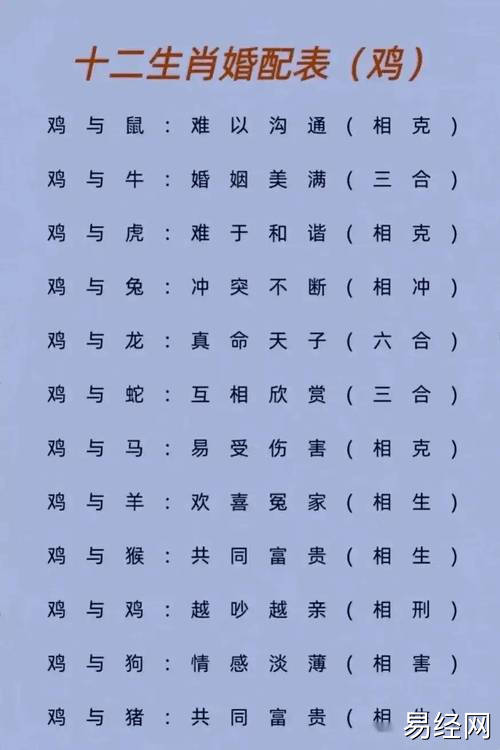 易经网推荐2025最新属鸡女与属马婚姻好吗 属鸡男和属马女婚姻能白头偕老吗是什么意思?,最新生肖运势,下面是详细内容: 缘分基础 五行相合:鸡属金,马属火,金生火,属马男能助旺属鸡女的运势,利于事...