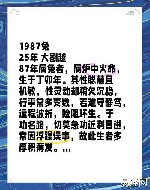 易经网推荐2025最新87年属兔感情如何样呀 87年的属兔婚姻状况是什么意思?,最新生肖运势,下面是详细内容: 1987年丁卯年出生的属兔人,在情感世界中往往呈现出一种温婉内敛,又渴望稳定和真挚的特质...