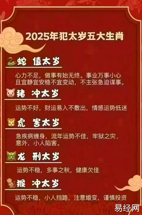 易经网推荐2025最新属蛇的人哪年犯太岁 太岁蛇2025年怎么化解是什么意思?,最新生肖运势,下面是详细内容: 属蛇之人,天生聪颖,心思细腻,善于观察,于人情世故中游刃有余。流年运势并非一成不变,某些...