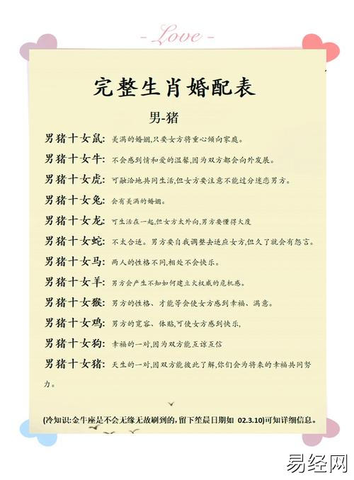 易经网推荐2025最新男属猪的最佳婚配对象是什么 男猪上等婚配一览表是什么意思?,最新生肖运势,下面是详细内容: 在中国传统文化中,属相不仅是一个人出生年份的标志,更被视为个性与命运的象征。属...