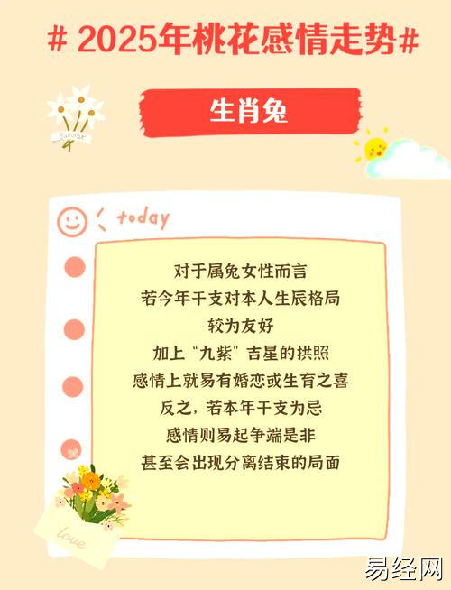 易经网推荐2025最新2025属兔女桃花运 87女兔2025年有桃花劫吗是什么意思?,最新生肖运势,下面是详细内容: 2025年,乙巳蛇年,对于属兔的女性而言,桃花运势呈现出复杂而多面的景象。机遇与挑战并存,...