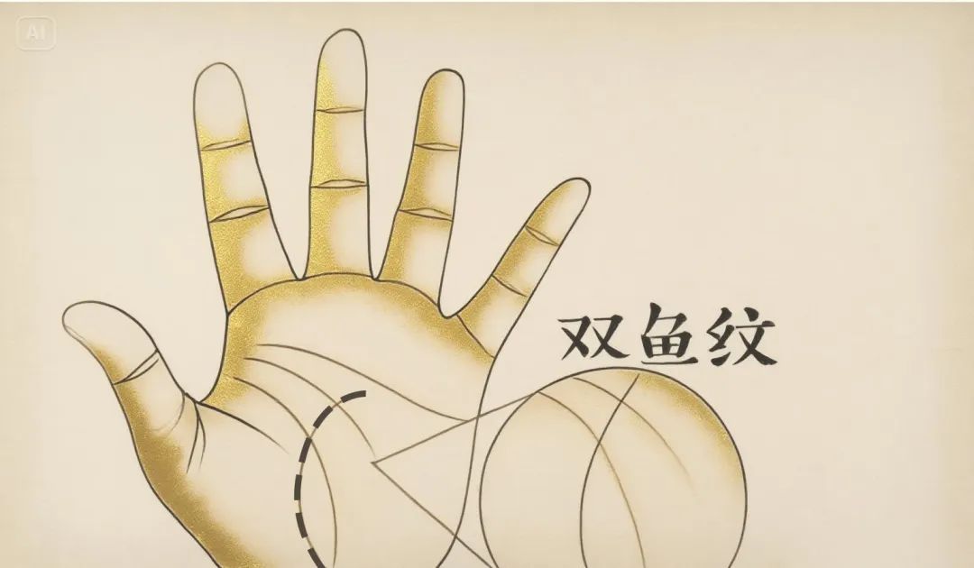 「双鱼纹现掌心间,才高八斗富贵全」—— 此纹主「文曲星附体」,学术、经商皆能登峰造极,如古今学者、院士多有此纹。