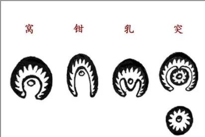 窝有四种——深窝、浅窝、狭窝、阔窝。窝形以左右均停为正格,左右不同是变格。又分藏口穴、张口两种,藏口是指左右砂手交会,张口是指左右砂手不交会。