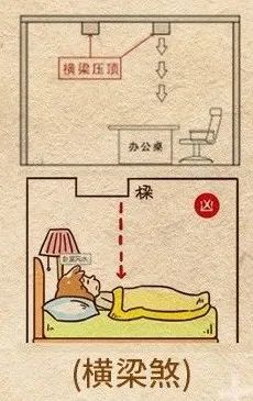 顾名思义,横梁压顶就是指一般承重力比较大的地方用钢筋混凝土进行加固、加粗而会突出来的部分。如果一个人长期坐或卧在横梁下,就会在工作上产生压力,运气受阻,这是一种破财损身的风水格局,谓之“横梁压顶”。然而,现在不少房屋中,屋顶有许多横梁。有些是由于建筑设计方面的原因,但也有一些是由于房东在装修时处理不当造成的。家中最容易出现横梁压顶的地方是: