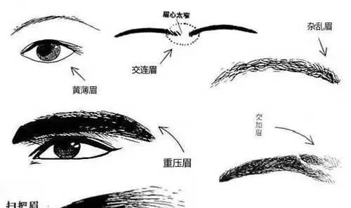 至于眉的禁忌比较多,包括忌粗、忌眉低压目、忌散、忌乱、忌短、忌速、忌交、忌连、忌黄薄、忌破缺、忌断,忌眉毛逆生、忌无眉等。