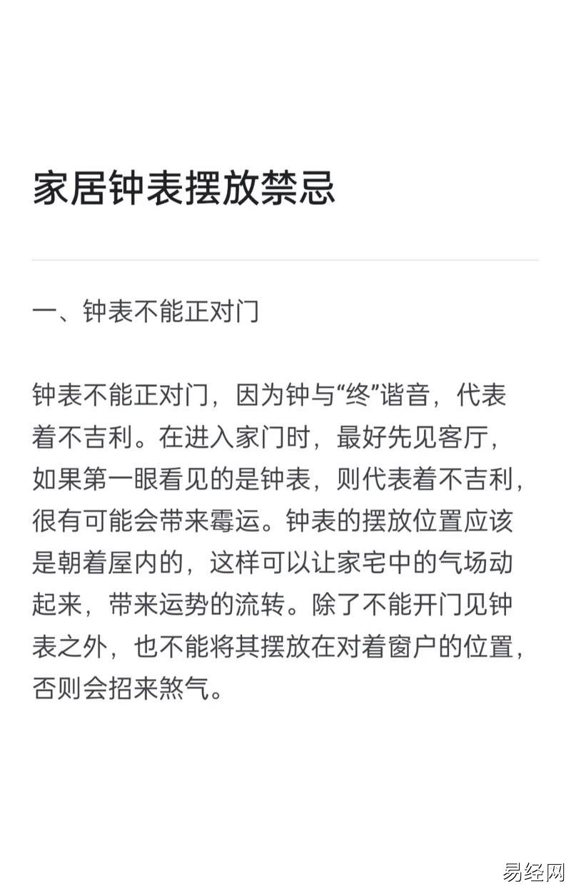 易经网推荐2025推荐客厅摆放钟表风水禁忌 客厅里摆放钟表的风水,最新易经风水,下面是详细内容: 时钟,不仅仅是记录时间的工具,在风水学中更象征着家庭的“运势”。客厅作为家庭的核心区域,钟表的摆...