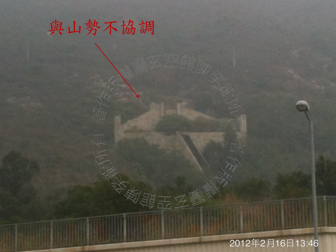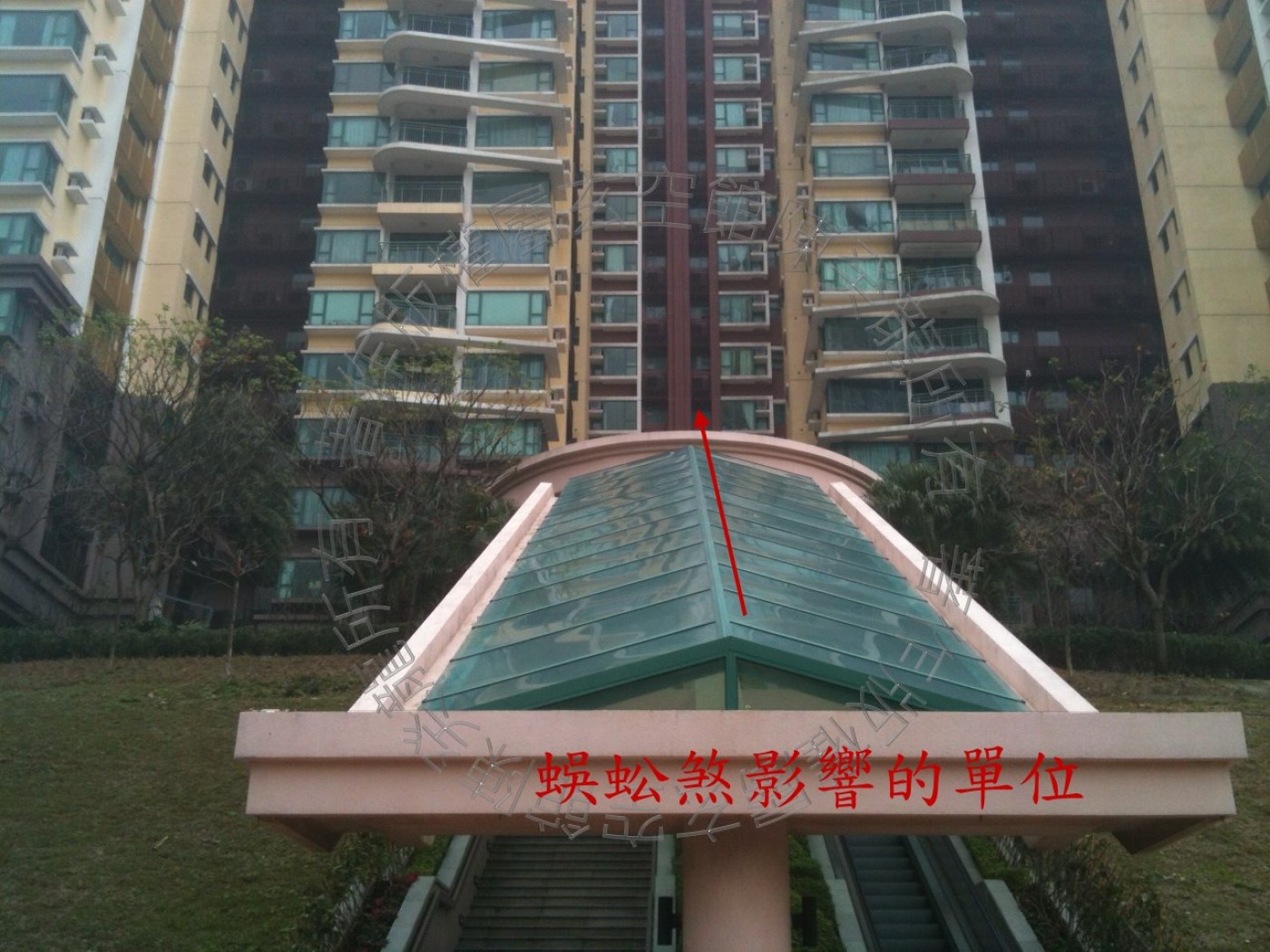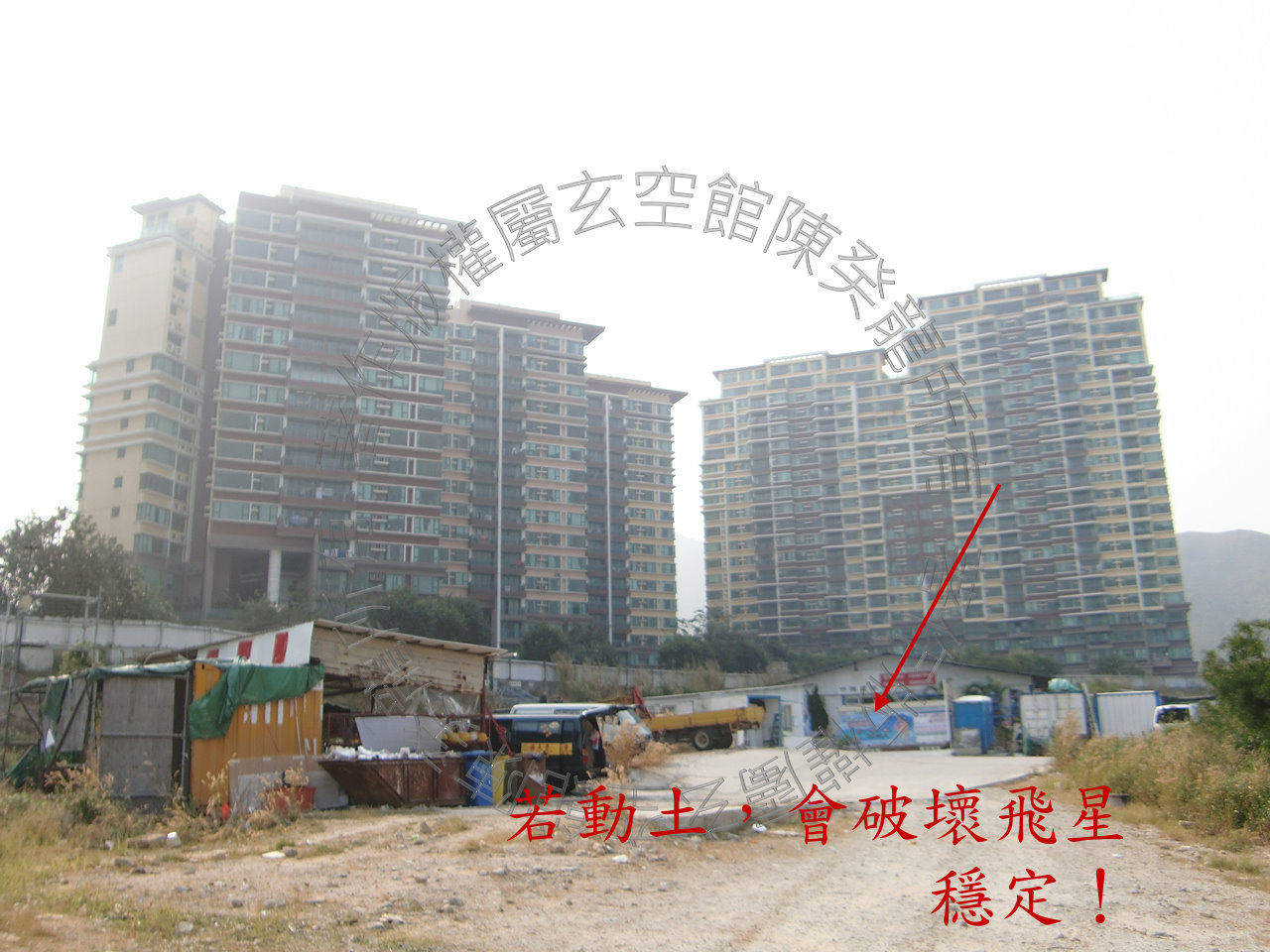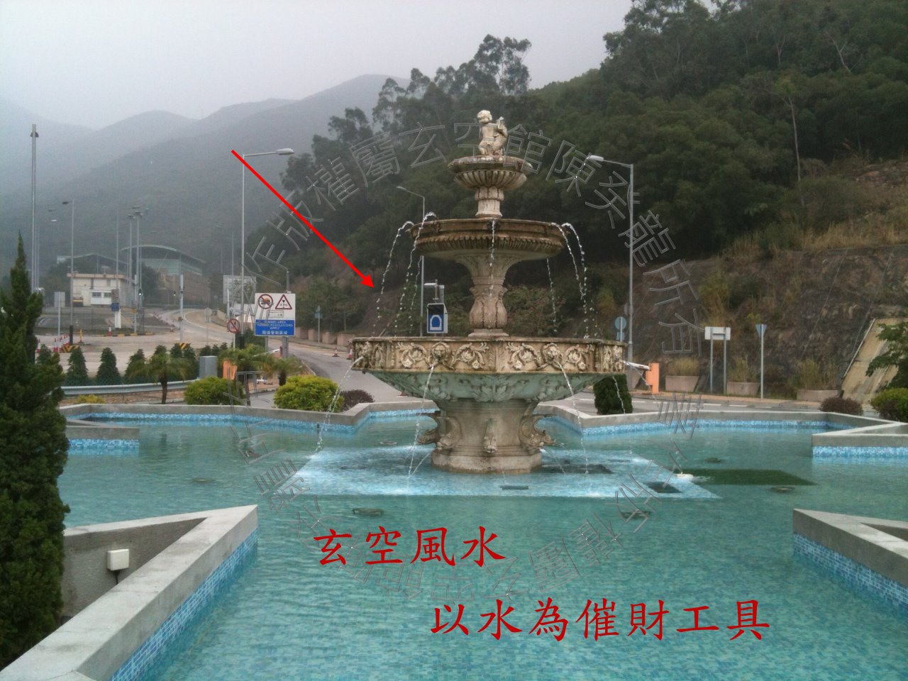 巒头上屋苑的焦点应在位处中央的泳池,可能考察当日是初春,泳池关闭及泳水干涸,没有聚蓄财力的工用,此泳池线条弧形,合玄空的要求。 玄空风水以水为催财的主要工具,既快见效而且可靠。 泳池附近有一凉亭,顶部由金属薄片组成,远观像鸟笼,且有很多尖角,这是形煞的一种,若此方的飞星带有刀剑,官讼的性情,则需留意。 此外,屋苑西方有一条行人电梯,电梯檐蓬顶成三角设计,带有蜈蚣的形态,顶端指向的单位有被冲射的可能。 电梯尽头的流水有四级,有利文昌运。 屋苑旁的喷泉回旋处,年终无休的流动,正是最有力的催财工具。 以上是可见的形煞及吉象,能否对住客构成影响,则需分析理气盘的变化才可定论。