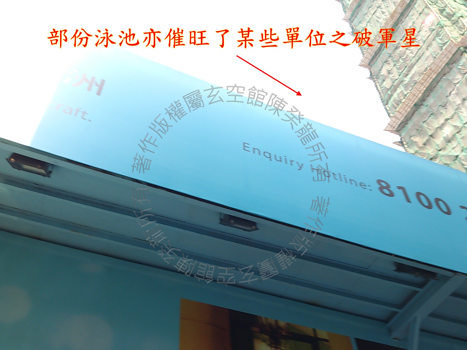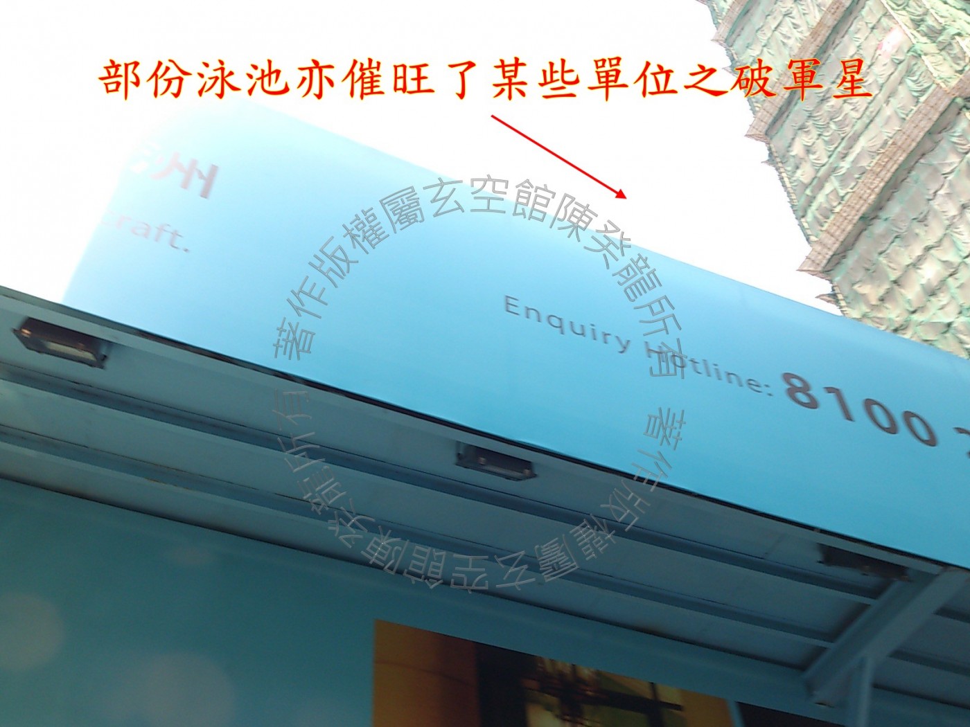 大厦立线只纳得玄空四大盘理之第四,此「上山下水局」巒理不合又逢向星全局伏吟,总体运势不为佳,得分不至过低因九星入本乡逢生助。 大厦西兑方见圣保禄医院,医院内充溢着血光和病人之怨气,此气煞巧遇理气星盘「四、七」手术之数,部份泳池亦催旺了某些单位之破军星,巽、兑皆为女卦,宅内女住客慎防血光之险。 大厦泳池位置与维多利亚港重叠,武曲星逢生气蓬勃,喜旁宫又见贪狼星,大利事业运。